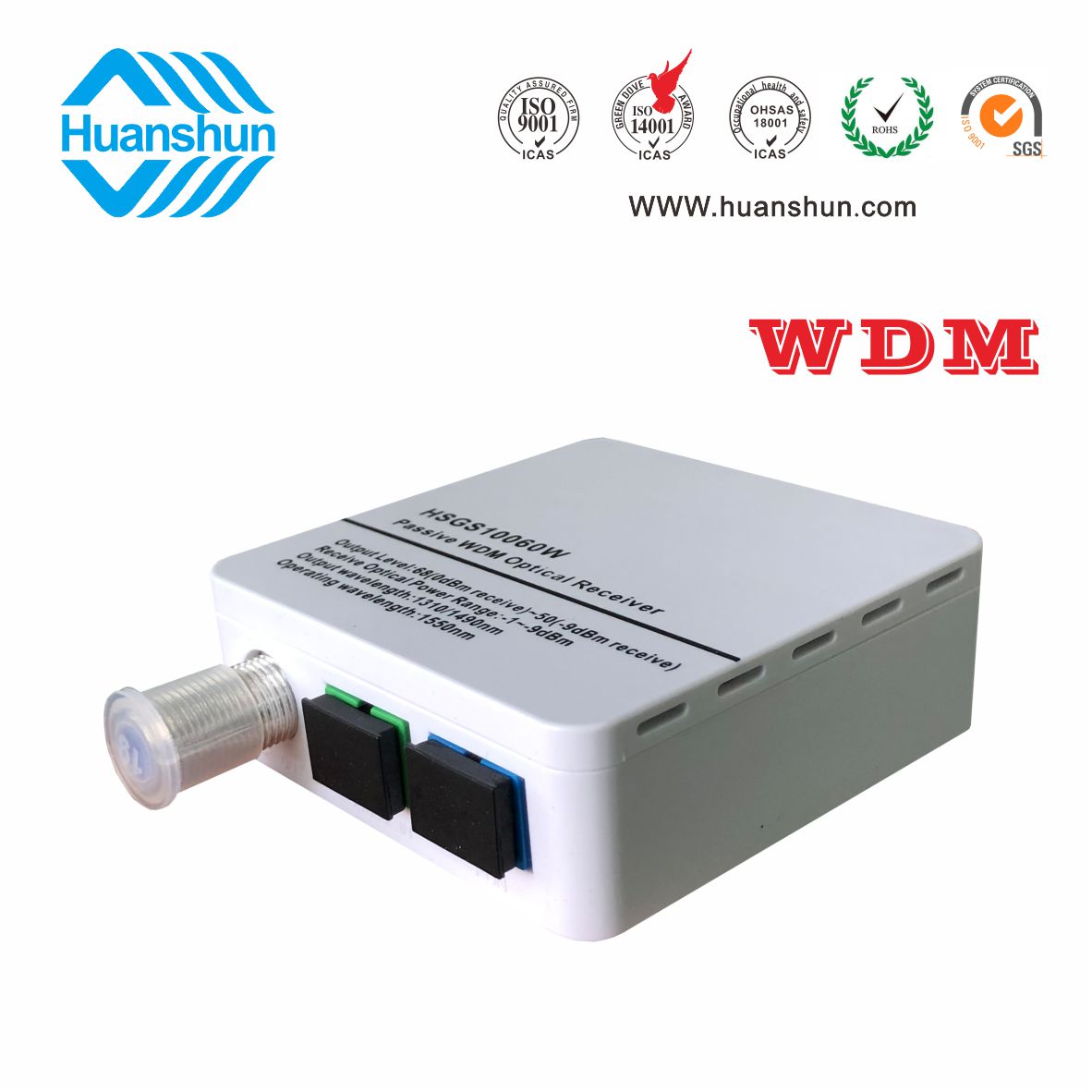 HSGS10060W/X是針對有線電視行業的特殊需求而開發的一款新穎實用的產品。它迎合被動終端接收設備的全光網絡傳輸光纖到家庭纖維和三波,并成功實現有線模擬/數字電視信號接收和數字光通信網絡數據轉換,即插即用很方便使用,無需外部電源安全性和節能。這臺機器使用了高靈敏度與WDM光電管,當收到在9 dbm轉換50 dbuv電纜模擬(數字級別42 dbuv)水平,沒有電源,功耗,節約和靈活,適合一個纖維三波光傳輸系統應用程序,不僅可以接收有線電視光傳輸信號,同時在其傳輸信號和E /GPON ONU/XPON連接。