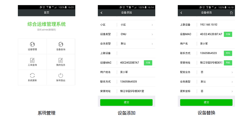 手機(jī)移動(dòng)端分為設(shè)備管理、設(shè)備查詢、工單查詢、我的任務(wù),通過(guò)手機(jī)APP對(duì)網(wǎng)絡(luò)進(jìn)行管理運(yùn)維。